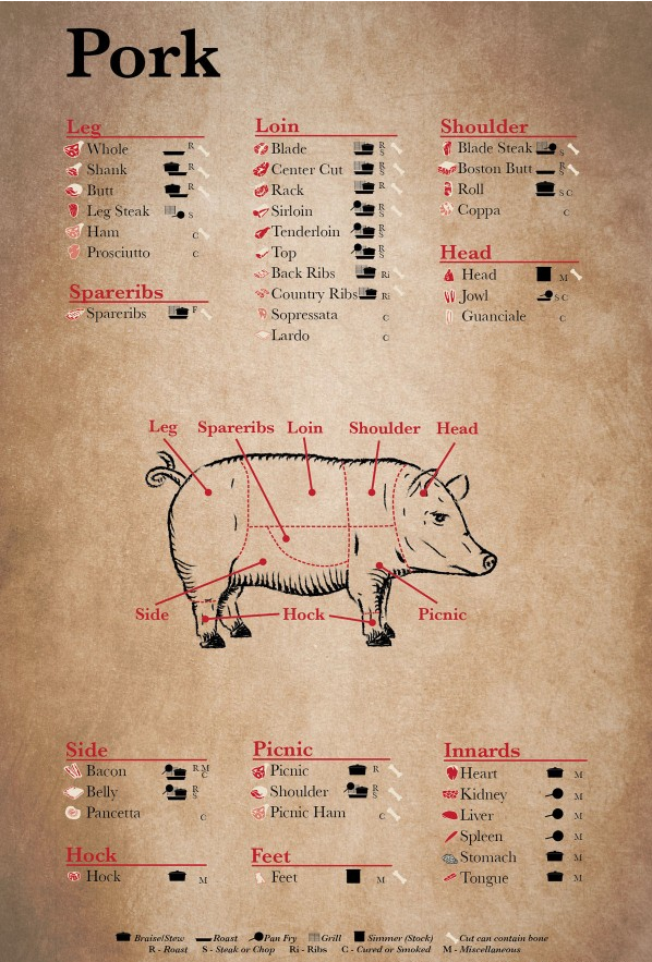 | Loin, center cut | Roast, braise, panfry, sauté, braise, grill | 145F |