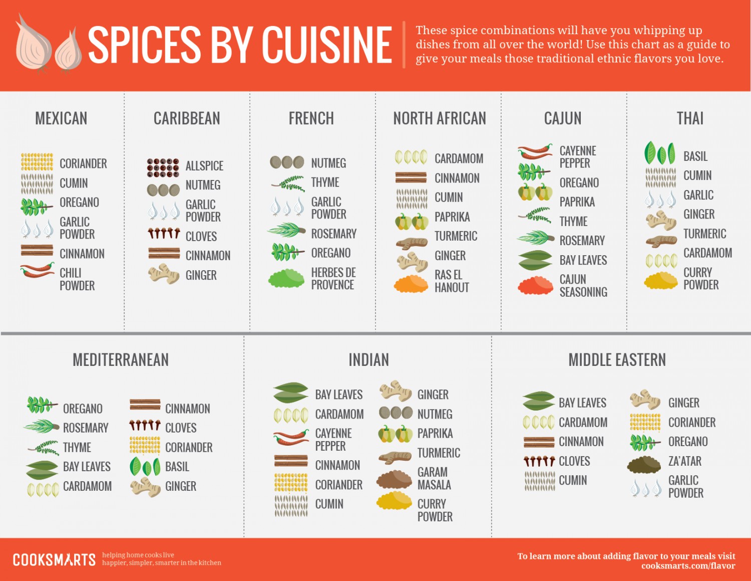| Cumin | Warm, earthy, pungent | Mexican, Mediterranean, Indian | Yes | No | Soups, stews, beans, curry, vegetables |