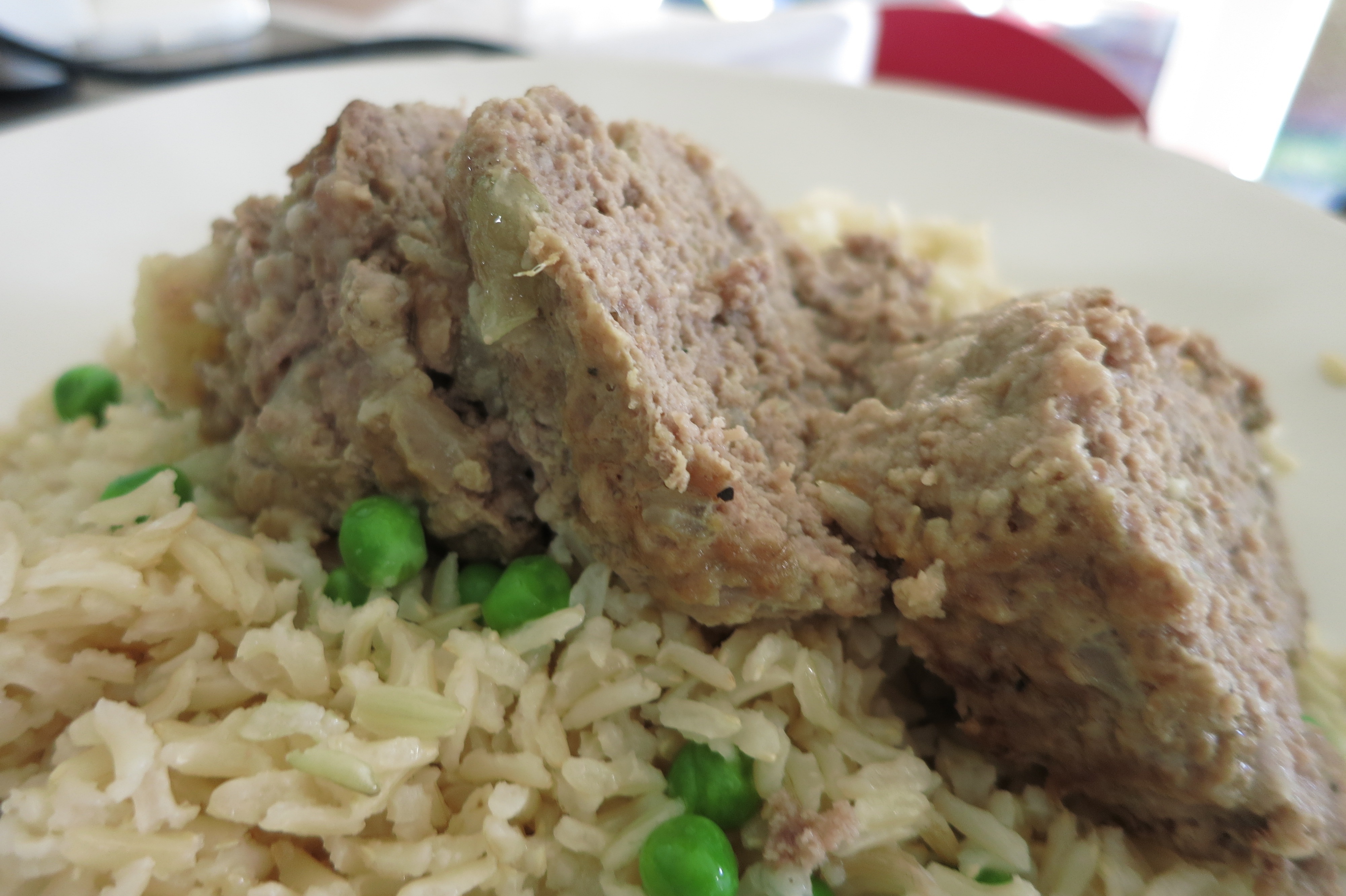 Dice onions. Fry them in Veggie oil. and take most of them out of the pan and combine with meet eggs and salt and pepper, garlic with uncrusted soaked bread., Mix well. Roll meat into 2 or 3 loafs of floor. Add watter and beef stoke to the fyr pan. let boil add meat. simmer for one hour on one side and turn over and simmer for another hour.